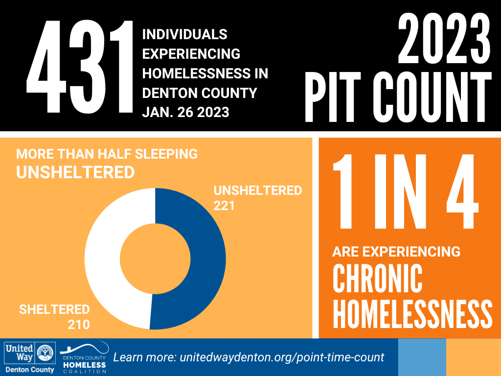 The 2023 State of Homelessness report is now available to the public. This report includes information from the 2023 Point In Time Count, as well as local data from many sources. You can join us in reviewing the report at the June 28th Coalition meeting 9am at Lewisville’s Next Steps Center. To download the full report, visit www.unitedwaydenton.org/point-time-count.